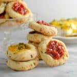 These savory thumbprint cookies are crisp on the edges, soft in the middle, with a kicked up sweet and spicy bourbon tomato jam in the center! An infinitely flavorful savory twist on the classic, these vegetarian cookies are great as party appetizers and for snacking.
